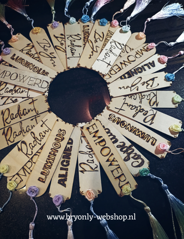 Een stijlvolle boekenleggen combineert natuurlijke materialen met een krachtig woord en is afgewerkt met een elegante tassel en roosje.